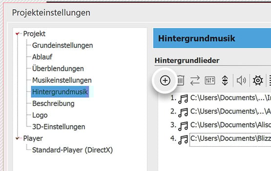 Klicken Sie in der Toolbar auf den Schalter "Musik", um die Hintergrundmusikliste zu öffnen. Klicken Sie danach auf das Plus-Symbol und wählen Sie die Musik aus. Sie können die Reihenfolge in der Liste per Drag&Drop anpassen.