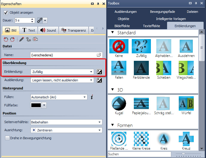 Variante a) Unter „Eigenschaften“ klicken Sie auf den Tab „Bild“. Dort können Sie eine Einblendung auswählen.