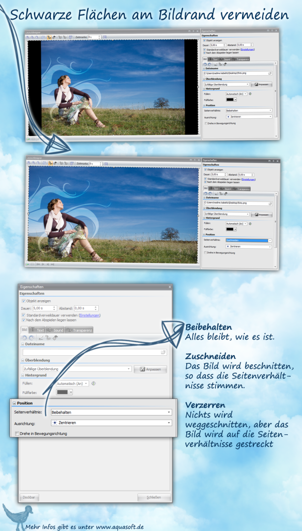Fotos werden in zahlreichen Formaten aufgenommen, da lassen sich Trauerränder bei der Darstellung nicht immer auf Anhieb vermeiden. In Ihrer DiaShow können Sie das Problem leicht lösen, indem Sie im rechten Eigenschaftenfenster im Karteireiter „Bild“ das Seitenverhältnis entsprechend ändern. Zeit sparen Sie bei mehreren Fotos, die das gleiche Seitverhältnis haben, indem Sie diese mit gehaltener STRG-Taste anklicken. Bei den so markierten Bildern müssen Sie die Einstellung nur einmal vornehmen.