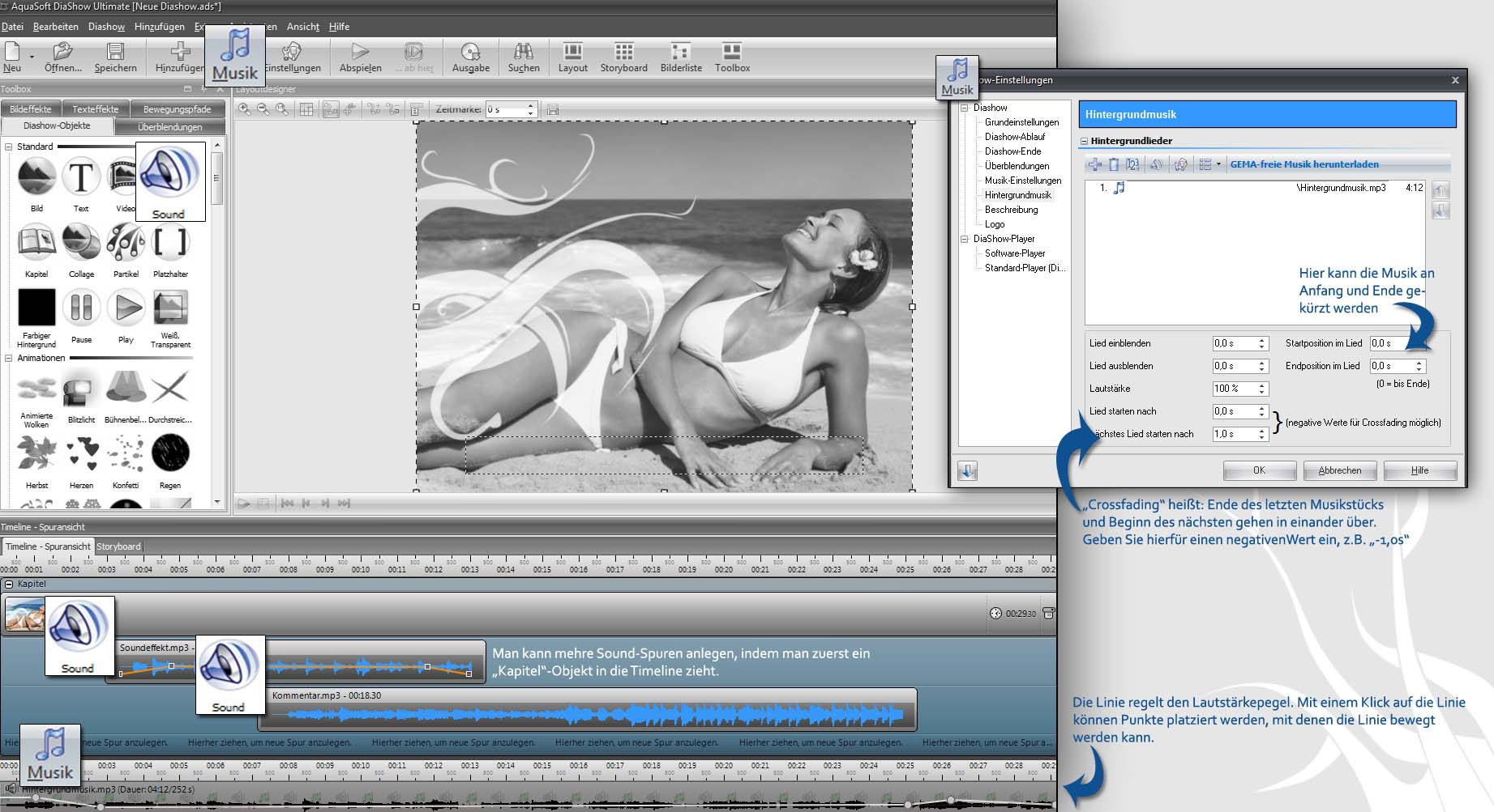 Musik bringt die richtige Atmosphäre in Ihre Präsentation. Ihre DiaShow hält unbegrenzt Spuren für die Abstimmung Ihrer Fotos mit Musik, Soundeffekten und Sprachkommentaren bereit. Durch sanftes Ein- und Ausblenden mehrerer Musikstücke, also das Crossfading, werden Sie zum Dirigenten: