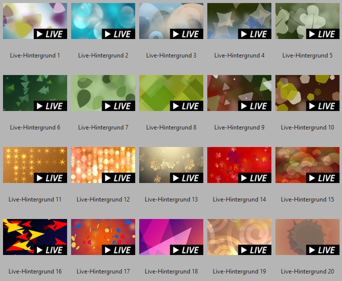 Ein animierter Hintergrund bringt Bewegung in eine Diashow oder ein Video – als bewegte Projektions-Unterlage für Bilder oder Texte oder auch als Zwischenspiel in Bilderfolgen. Einige Live-Hintergründe sind fester Bestandteil von Diashow 11 und Stages 11 und viele Erweiterungspakete bringen diese Live-Animationen ebenfalls mit. Die „volle Packung“ gibt es mit dem Erweiterungspaket „Abstrakte Live-Hintergründe“.