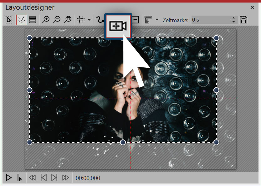 Nachdem Sie Ihre Fotos eingefügt haben, klicken Sie das erste Bild, in das Sie hinein zoomen möchten, an. Sie sehen jetzt die Vorschau im Layoutdesigner. Über der Vorschau sehen Sie ein kleines Kamera-Symbol. Um mit dem Kameraschwenk arbeiten zu können, klicken Sie auf das Symbol. Wenn Sie jetzt an den runden Anfassern ziehen, die sich an jeder Ecke der Vorschau befinden, legen Sie den Ausschnitt fest, der als erstes zu sehen sein soll. Wenn Sie in das Bild hinein zoomen möchten, darf dieser Ausschnitt also ruhig etwas größer sein.
