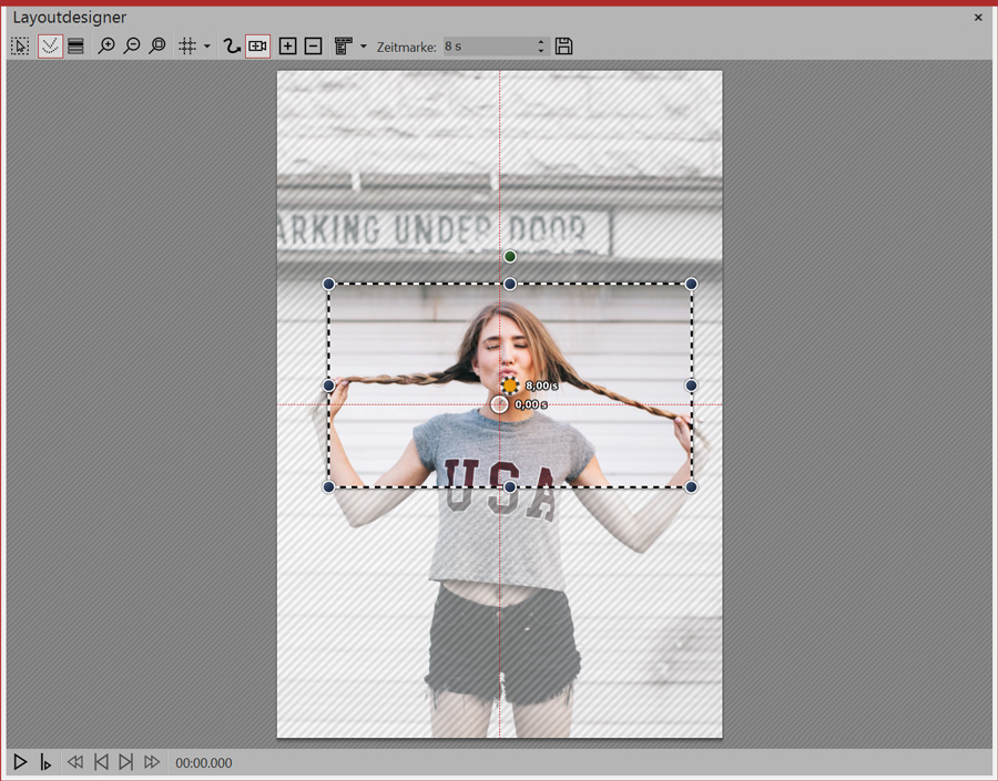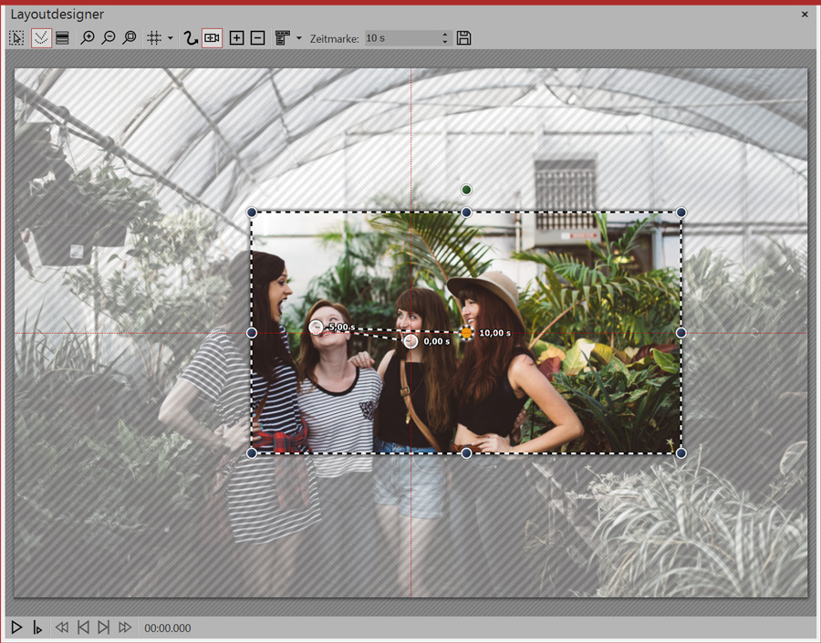 Unter „Zeitmarke“ (oben im Layoutdesigner) steht wahrscheinlich noch der Wert „2 s“. Das bedeutet, dass von Punkt 1 zu Punkt 2 innerhalb von zwei Sekunden gezoomt wird. Meistens dauert aber schon allein die Einblendung zwei Sekunden. Stellen Sie hier einen höheren Wert ein, der zwischen fünf und zehn Sekunden liegt. Je höher der Wert, desto langsamer wird gezoomt.