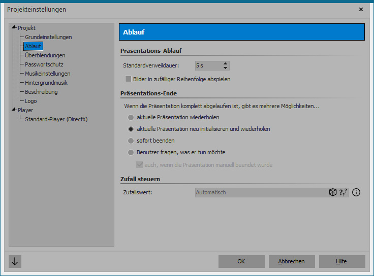 Sie können für eine solche Präsentation festlegen, was am Ende passieren soll, also wenn alle Bilder des Verzeichnisses ausgespielt wurden.