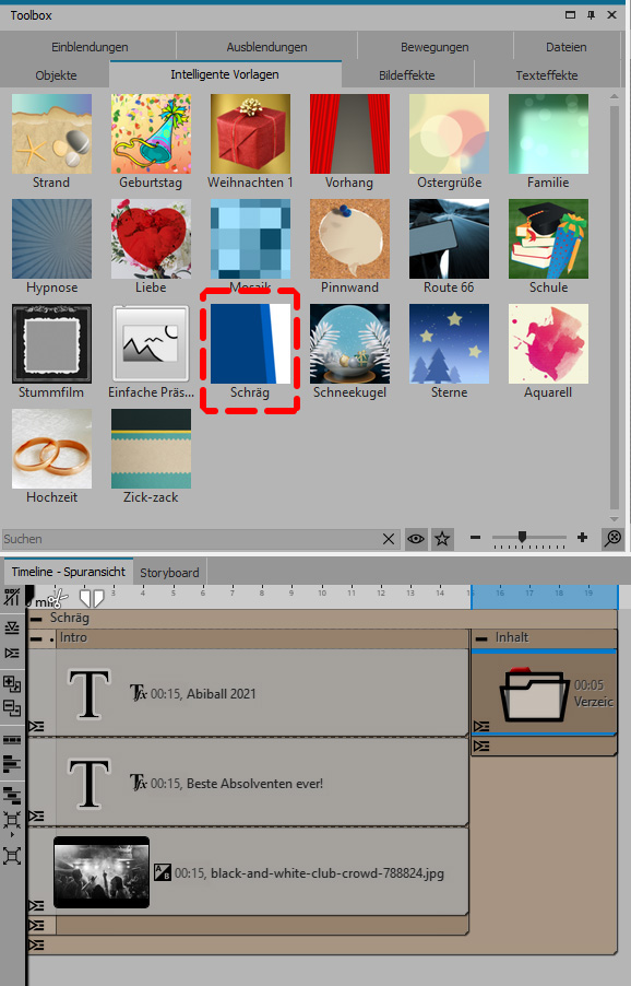 2. Ziehen Sie die Intelligente Vorlage „Schräg“ aus der Toolbox > Reiter „Intelligente Vorlagen“ in die Timeline. Es erscheint eine Bild-einfüge-Aufforderung. Fügen Sie zunächst ein Bild ein. (Dieses erscheint immer wieder im Vorspann.) Geben Sie danach einen Titel und Untertitel ein.