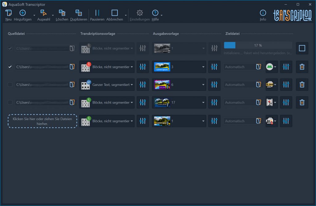 Nutzt du den Transcriptor bzw. eine Transkriptionsvorlage das erste Mal, wird zunächst das passende Sprachmodell auf den Rechner heruntergeladen. Im Anschluss startet die Transkription und dann die Ausgabe bzw. Videoerzeugung.