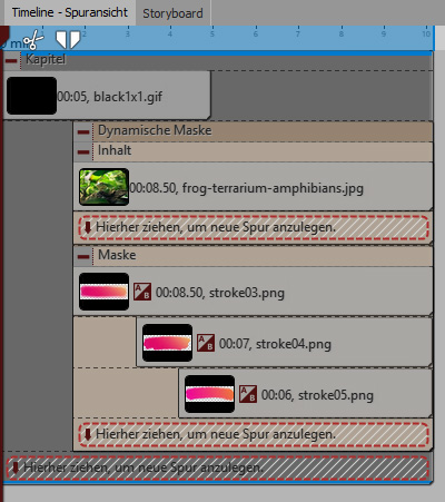 Nun wird noch ein zeitlicher Versatz eingerichtet, Maske 2 und 3 also versetzt angeordnet. Alle benötigten Objekte von der Anzeigedauer verlängern. Der Effekt ist nun fertig. Diesen Aufbau können Sie für viele andere Variationen des Themas nutzen.