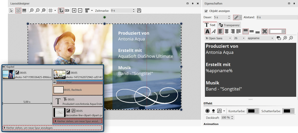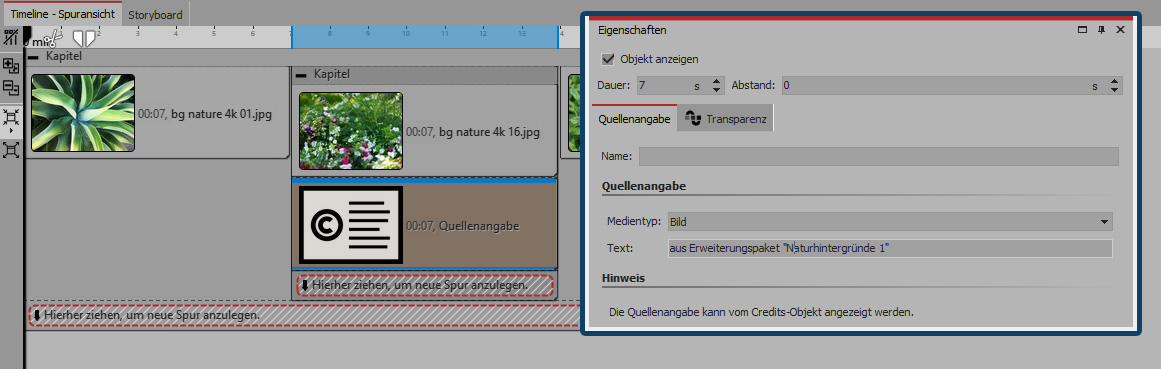 Um eine allgemeine Quellenangabe zu machen oder eine Information zur Hintergrundmusik zu hinterlassen, können Sie das Quellenangabe-Objekt auch an einer anderen Stelle einfügen, zum Beispiel in einer zusätzlich unterstes Spur.
