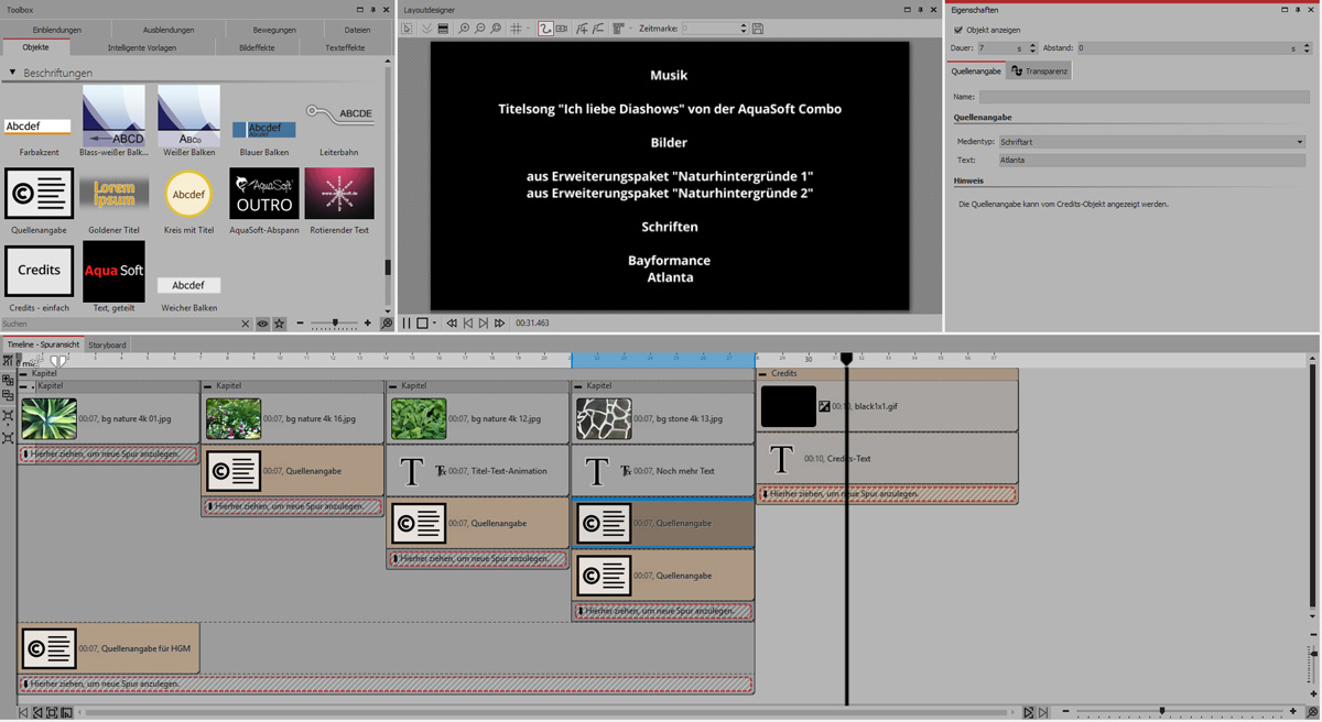 Bei langen Projekten kann es mühselig sein, das ganze Projekt noch einmal durchzugehen und alle Informationen am Ende zusammenzutragen. Dafür gibt es mit Version 11 jetzt auch das Quellenangabe-Objekt. Dieses können Sie in Ihre Show schon beim Erstellen einsetzen, sobald quellenrelevante Informationen vorhanden sind. Das Credits-Objekt liest diese Informationen aus und zeigt sie automatisch an.