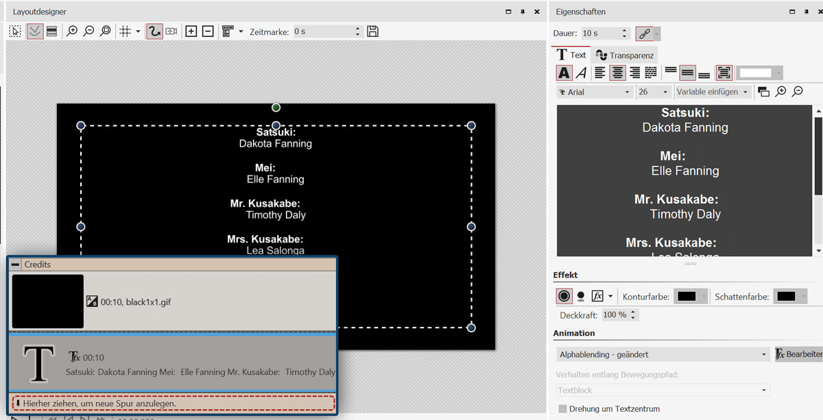 Eingefügt wird ein schwarzer Hintergrund, den Sie beschriften können. Dazu öffnen Sie das Objekt in der Timeline und klicken auf das Text-Objekt. Im Bereich „Eigenschaften“ geben Sie jetzt Ihre Credits ein.