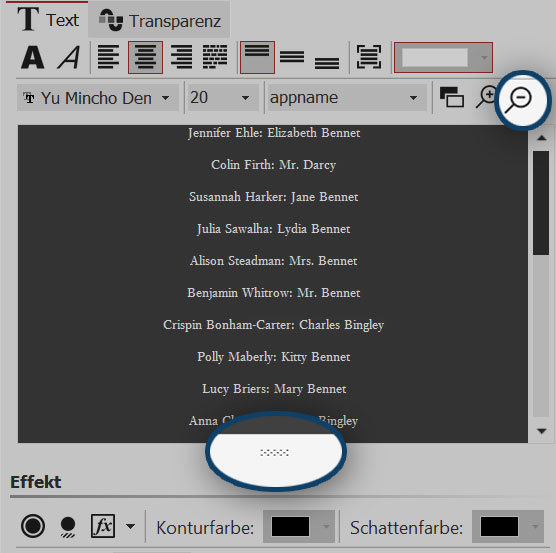 Je mehr Text Sie eingeben, desto kleiner wird die Schrift. Die Schriftgröße passt sich also immer der Textmenge an, sodass alle Credits sofort zu sehen sind.