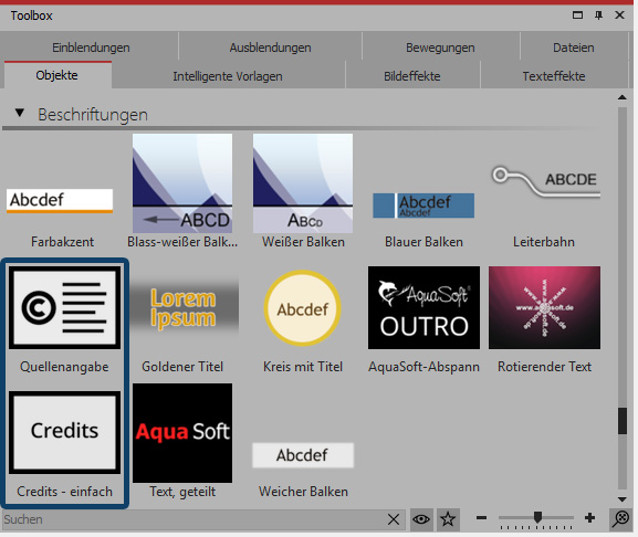 Wenn Sie die Credits am Ende des Videos möglichst schnell und einfach einfügen wollen, nehmen Sie das Objekt „Credits – einfach“. Sie finden es im Tab „Objekte“ im Abschnitt „Beschriftungen“. Ziehen Sie es aus der Toolbox ganz an das Ende der Timeline.