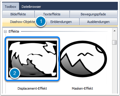 Den Effekt finden Sie in der Toolbox im Reiter Diashow-Objekte (1) gleich unter den Standard-Objekten (2). Danach steht Ihnen ein Container mit zwei Spuren in Ihrer Timeline zur Verfügung. Die Obere ist für das Bild und die Untere für die Textur. Sie können eigene Texturen erstellen, z.B. mit der Freeware GIMP oder Photoshop. Im Internet werden Sie ebenfalls fündig, wenn Sie nach „gratis Texturen“ suchen. Nutzen Sie zum Ausprobieren einfach den Hintergrund „Backpapier“.