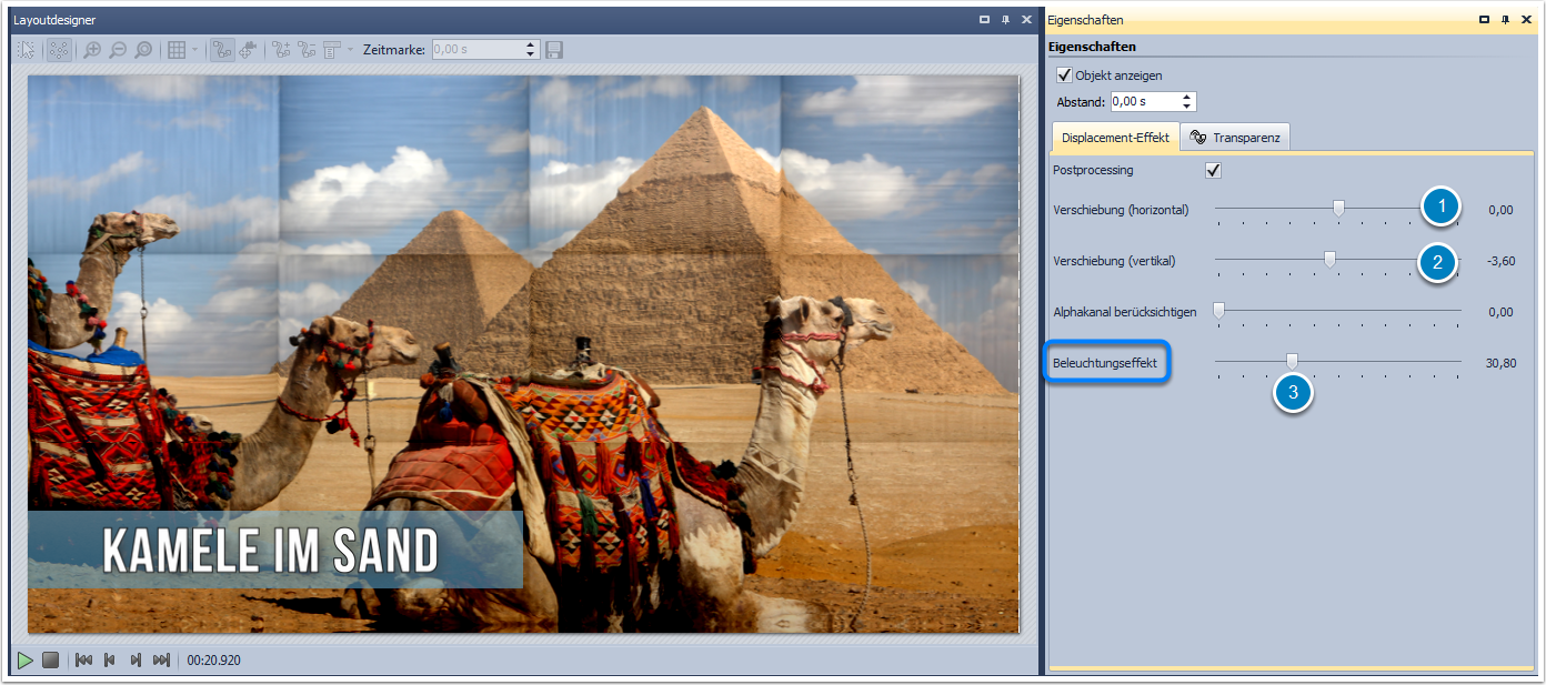 Für das Durchscheinen der Textur ist allein der Beleuchtungseffekt (3) verantwortlich. Die Verschiebung zu den Seiten (1) oder in die Höhe (2) sollten Sie zunächst auf 0 setzen.
