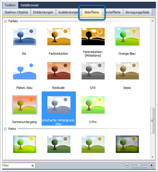 Noch einfacher geht’s mit den zahlreichen fertigen Bildeffekten in Ihrer Toolbox.