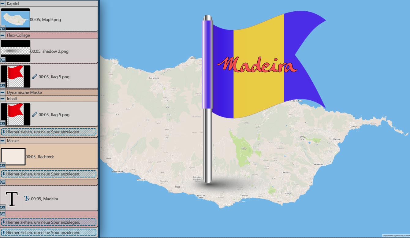 Ziehen Sie eine Flexi-Collage in die Timeline und fügen Sie erst einen Pin ein. Unter den Pin ziehen Sie nun den Schatten. Platzieren Sie den Schatten im Layoutdesigner passend.