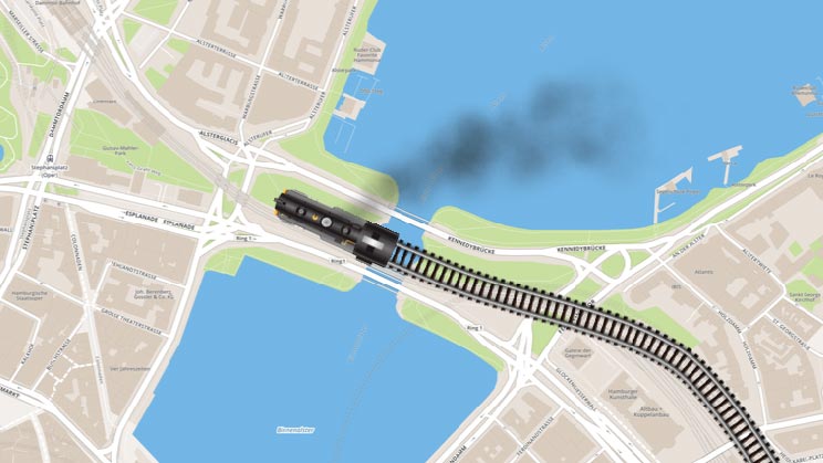 Eine Lok fährt über die Landkarte und hinterlässt dabei eine Rauchwolke. Die Gleise erscheinen erst, wenn die Lok voran gefahren ist.