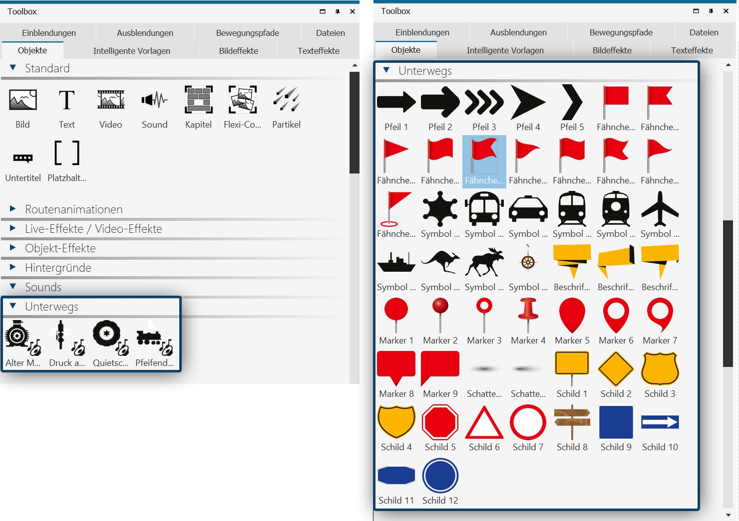 In der Toolbox finden Sie eine Reihe von Fähnchen und Schildern, die sich gut in das Thema Reiseroutenanimation einfügen. Die Objekte können Sie auch beschriften oder miteinander kombinieren.