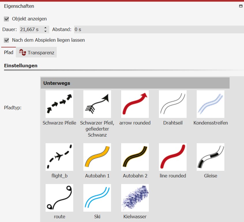 Ziehen Sie immer zuerst das Objekt „Dekorierter Pfad“ in die Timeline oder wählen Sie es aus, indem Sie es in der Timeline anklicken. Dann erst sehen Sie die Optionen im Bereich „Eigenschaften“. Am besten ist es, wenn Sie Ihre Route bereits angelegt haben, so wissen Sie schon, welche Größe die Fahrzeuge und die Spuren haben müssen.