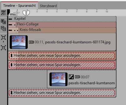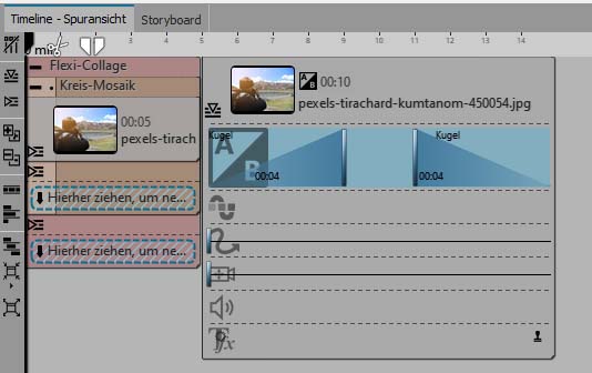 Geben Sie dieser eine Einblendung, z.B. „Wischen“ oder „Alphablending“. Als Ausblendung erhält die Flexi-Collage „Liegen lassen, nicht ausblenden“.