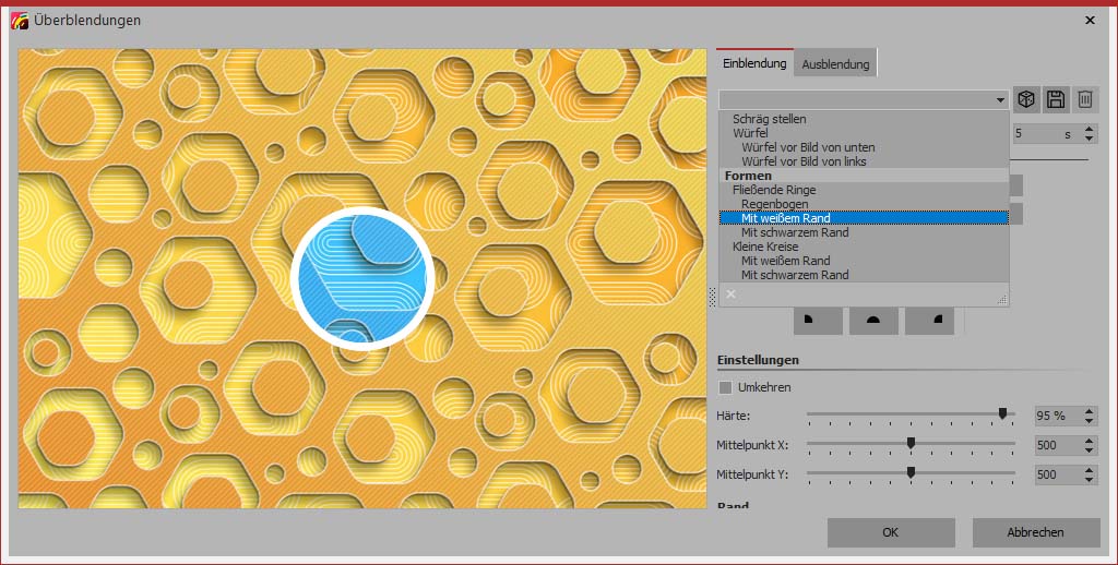 Wählen Sie für das Nachfolgebild als Einblendung „Kreis mit weißem Rand“. Über „Anpassen“ lässt sich wiederum die Dauer der Einblendung erhöhen, die Härte des Kreisrandes und die Randfarbe ändern. Lassen Sie den Kreis mittig erscheinen oder verschieben Sie den Ursprung mittels „Mittelpunkt X“ und „Mittelpunkt Y“ auf ein interessantes Detail des Bildes.