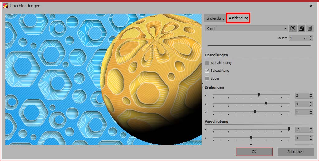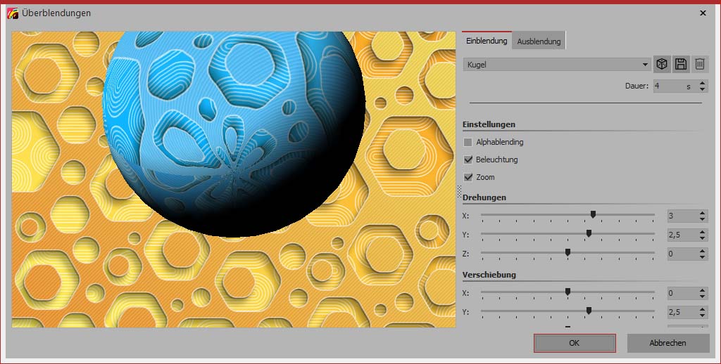 Wählen Sie für das Nachfolgebild als Einblendung „Kugel“. Unter „Anpassen“ können Sie die Dauer der Einblendung erhöhen und angeben, wie oft und in welche Richtung sich die Kugel drehen soll. Auch Einstellungen zur Beleuchtung an/aus und ob die Kugel mit Alphablending und Zoom erscheinen soll, sind möglich.