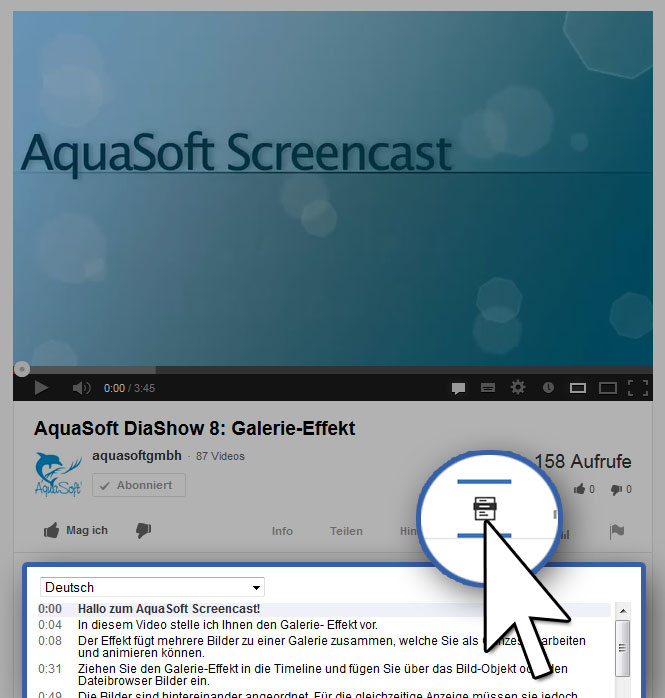 Sollte es zu schnell gehen, können Sie zum Pausieren immer wieder die Leertaste drücken. Zusätzlich gibt es ein Transkript, in dem Sie die Schritte noch einmal verfolgen können (dazu rufen Sie das Video direkt auf). Wenn Sie im Transkript auf eine Textstelle klicken, gelangen Sie zu der entsprechenden Stelle im Video. So können Sie das Gezeigte Schritt für Schritt nachmachen.
