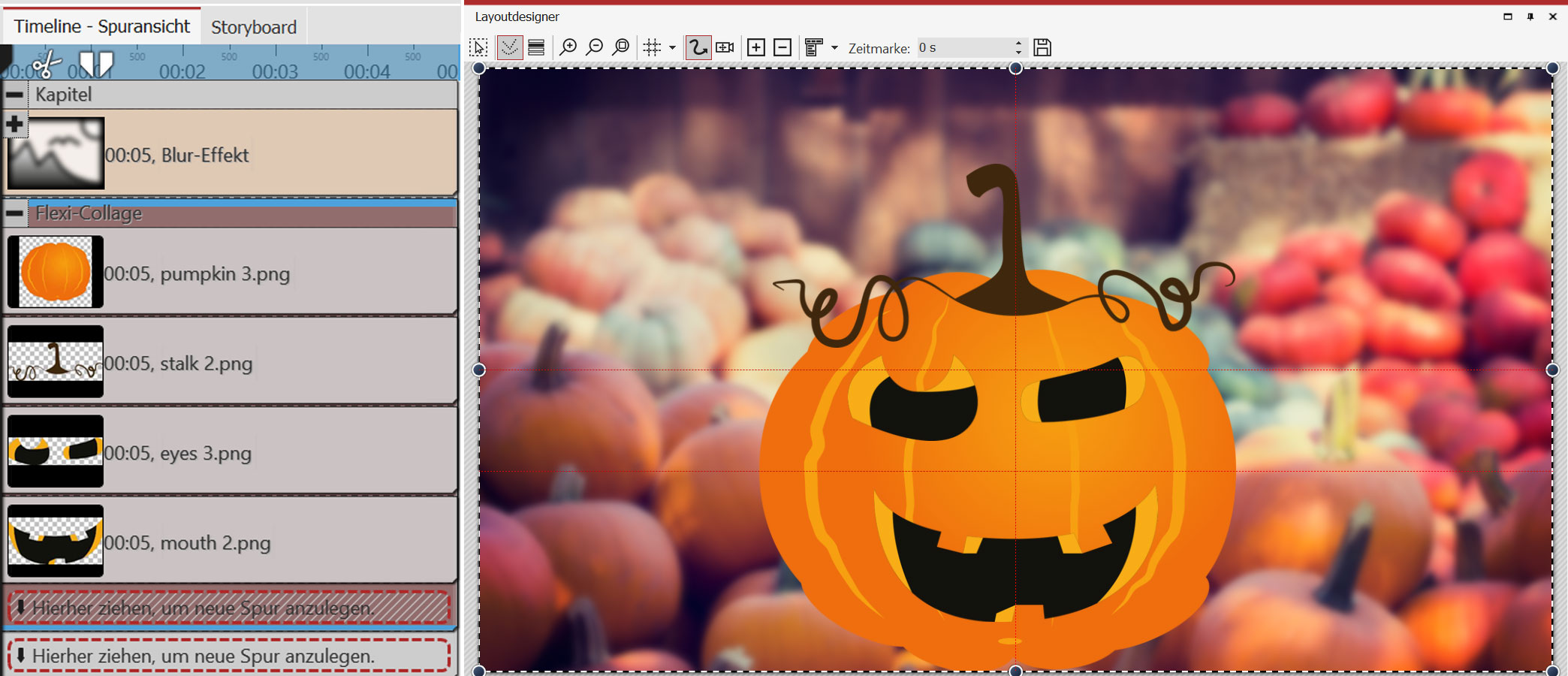 Sie sieht der Aufbau des Kürbisgesichtes in der Timeline aus, daneben das Ergebnis im Layoutdesigner