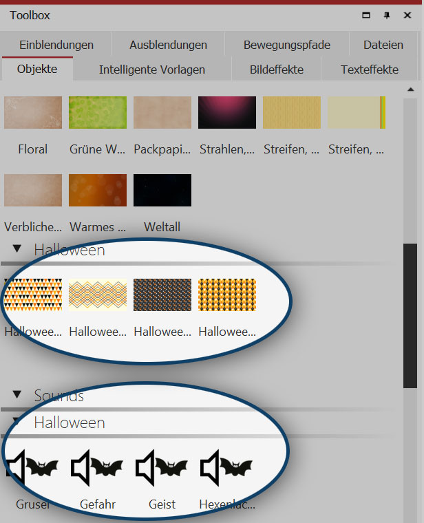 Es gibt nicht nur Deko-Elemente, sondern auch Sounds und Hintergründe – probieren Sie alles aus 🙂 Nachfolgend sehen Sie ein Video, ab Minute 01:27 sehen Sie auch einige Beispiele, wie man die Deko-Elemente einsetzen kann. Im Video reiße ich es nur kurz an, aber wenn Sie zu bestimmten Effekten Fragen haben, schreiben Sie gerne auch einen Kommentar unter diesem Artikel.
