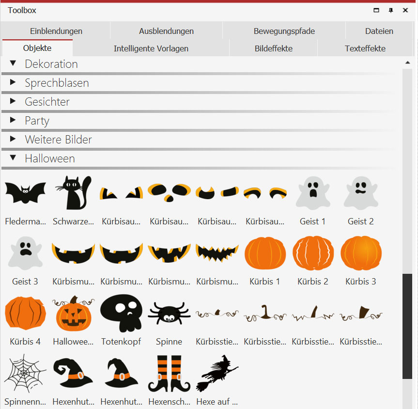 Im Tab „Objekte“ finden Sie im Abschnitt „Dekoration“ den Unterabschnitt „Halloween„. Hier befinden sich alle Dekorationen aus dem Paket, darunter auch einige Kürbisse und dazu passende Münder, Strünke und Augen. Diese können Sie kombinieren und so verschiedene Variationen von Kürbisgesichtern erstellen. Jedes Element kann dabei auch animiert werden – zwinkernde Augen, bebendes Lachen – Sie finden bestimmt noch viele weitere Ideen.