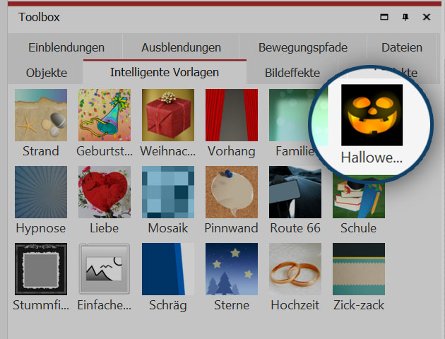 Im Tab „Intelligente Vorlagen“ sehen Sie die neue Vorlage „Halloween“. Diese Intelligente Vorlage eignet sich für Videos und Fotos, die Sie natürlich auch beschriften können, Sie können ebenfalls Text-Objekte einfügen und so eine gruselige Texttafel erstellen. Die Intelligente Vorlage „Halloween“ enthält Sounds und Musik, die für eine schaurige Stimmung sorgen – Sie können aber auch Ihre eigene Musik verwenden.