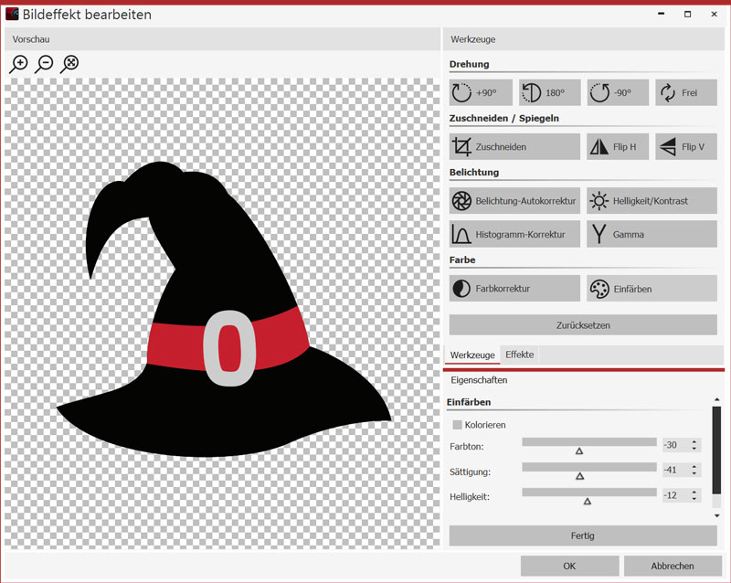 Wenn Sie die Farbe des Hutbandes ändern wollen, gehen Sie in den Bildeditor (alternativ kann man auch das Bild in der Timeline mit der rechten Maustaste anklicken und „Bild bearbeiten“ wählen). Dort gibt es das Werkzeug „Einfärben“. Ändern Sie den Farbton, bis er Ihnen gefällt.