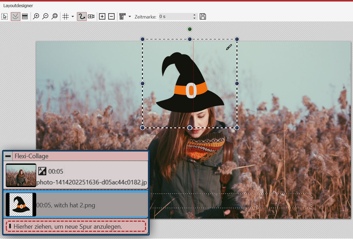 Wenn Sie jemanden einen Hut aufsetzen wollen, ziehen Sie zuerst das Foto in die Flexi-Collage. Jetzt ziehen Sie den Hut unter das Bild in die Flexi-Collage. Positionieren Sie den Hut und lassen Sie ihn mit Hilfe eines Bewegungspfades vielleicht noch ein bisschen hin und her wackeln.
