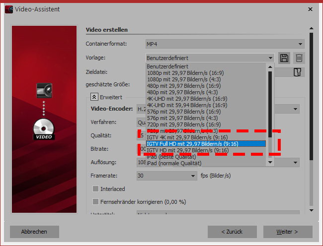 Ist das Video fertig gestaltet, geht es an die Ausgabe. Verwenden Sie > Assistenten > Video brennen/erzeugen und wählen Sie mp4. bei den Vorlagen finden Sie bereits optimale Exporteinstellungen unter dem Stichwort „IGTV“. Je nach benötigter Auflösung wählen Sie die Vorlage IGTV 4K (2160×3840 / nicht in DiaShow 10 Premium), IGTV Full HD (1080×1920) oder IGTV HD (720×1280), legen den Speicherort für die Zieldatei und starten die Videoerzeugung („weiter“ klicken).