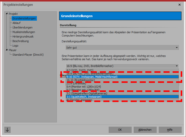 In diesem Beitrag haben wir bereits die Erstellung von Hochkant-Videos in unserer Animationssoftware Stages 10 erklärt. Ab sofort ist auch mit unseren DiaShow-10-Programmen Premium und Ultimate ganz schnell ein Video in 9:16 produziert: durch das aktuelle Update 10.5.13 lassen sich jetzt auch per einfacher Projekteinstellung Hochformat-Vollbild-Videos erstellen und speichern. (Das quadratische 1:1-Format steht weiterhin in allen Programmen zur Auswahl.)