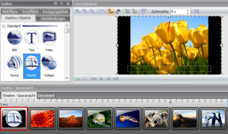 Nun war aber nicht alle Arbeit, die Sie sich gemacht haben, vergebens, denn auch in eine bereits gut gefüllte Diashow kann man noch nachträglich ein Kapitel einfügen und dort alle Bilder hineinschieben. Hier die Schritt-für-Schritt Anleitung:
