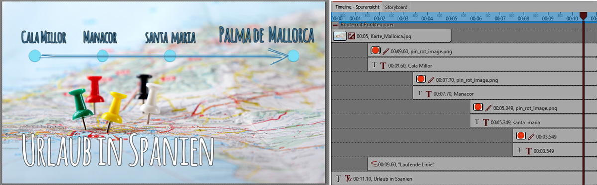 Im Erste-Schritte-Video wird nach der Einführung in die Routenanimation bereits eine Gestaltungsidee mit Pin und Klebezettel gezeigt. Aber die Phantasie kennt keine Grenzen – weitere Karten-Lösungen zum Beispiel für Ihre nächste Urlaubs-DiaShow werden hier mit Hinweisen zum leichten Nachmachen gezeigt.
