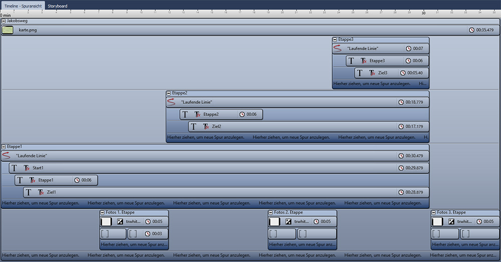 - In dieses Kapitel wird eine Spur tiefer ein neues Kapitel mit dem Namen „Etappe1“ eingefügt. Darin platzieren Sie in jeweils eigenen Spuren: