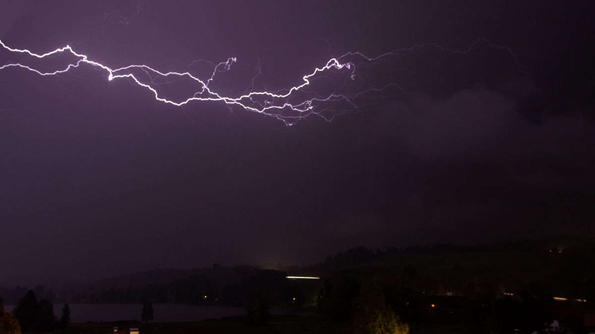 Der Himmel verdüstert sich, ein Gewitter zieht auf. Die Wolken ballen sich drohend zusammen. Nehmen Sie unbedingt einen Vordergrund mit ins Bild und wählen Sie eine knappe Belichtungszeit. Und dann geht es los. Es donnert gewaltig und die ersten Blitze zucken über den Nachthimmel.