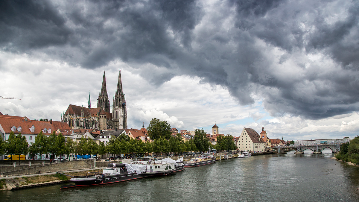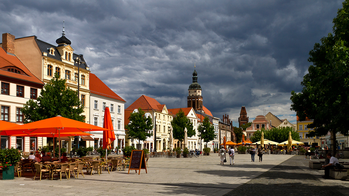 Gerade war der Himmel noch blau und jetzt zieht eine schwere Wolkenfront über den Himmel. Noch scheint die Sonne und beleuchtet spotartig den Marktplatz. Halten Sie dieses „Geschenk des Himmels“ mit seiner Dramatik unbedingt fest. Gleich wird es heftig regnen und das Schauspiel ist vorbei. Verpassen Sie es nicht!