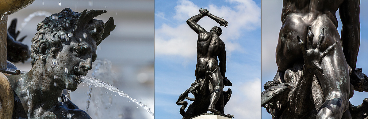 Oft haben die zentralen Brunnenfiguren die Eigenschaft, einsam auf ihrem Podest zu stehen. Im HD-Format bleibt da viel Leerraum. Ein Glück, wenn attraktive Wolken den leeren Raum füllen. Wenn nicht, greifen Sie zur Selbsthilfe, machen eine Collage und füllen den Leerraum mit verschiedenen Elementen des Brunnens. So können Sie auch gleich eine fotografische Geschichte darüber erzählen.