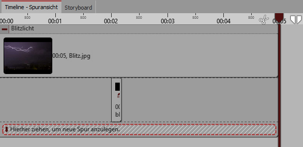 Tipp für „Blitzeffekt“ in der DiaShow: Das geht blitzschnell. In der Toolbox finden Sie unter „Animationen“ das Blitzlicht. Ziehen Sie es in die Timeline und fügen Sie Ihr Blitzbild ein. Verschieben Sie das kurze Objekt in der zweiten Spur etwas nach rechts und kürzen Sie die Anzeigedauer auf ca. 0,2 Sekunden. Beim Abspielen wird Ihr Blitz nun blitzen!