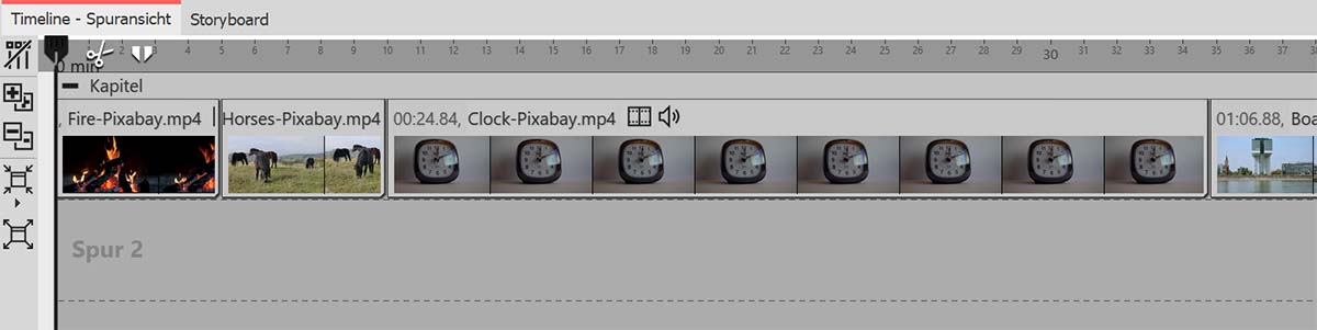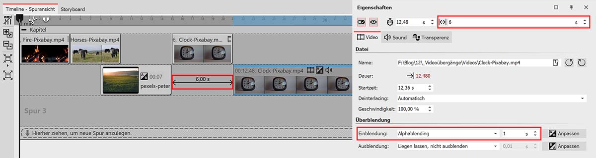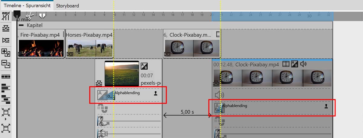 Wie weit das Nachfolge-Objekt mit dem Video überlappen muss, ist abhängig von der Dauer des Alphablendings. Haben Sie dort 2 Sekunden gewählt, sollte die Überlappung auch 2 Sekunden betragen.
