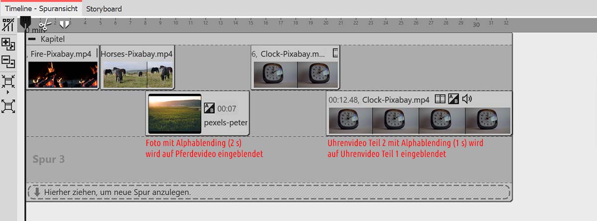 Legen Sie das Nachfolge-Objekt mit der Einblendung „Alphablending“ in eine Spur unter das Video-Objekt.