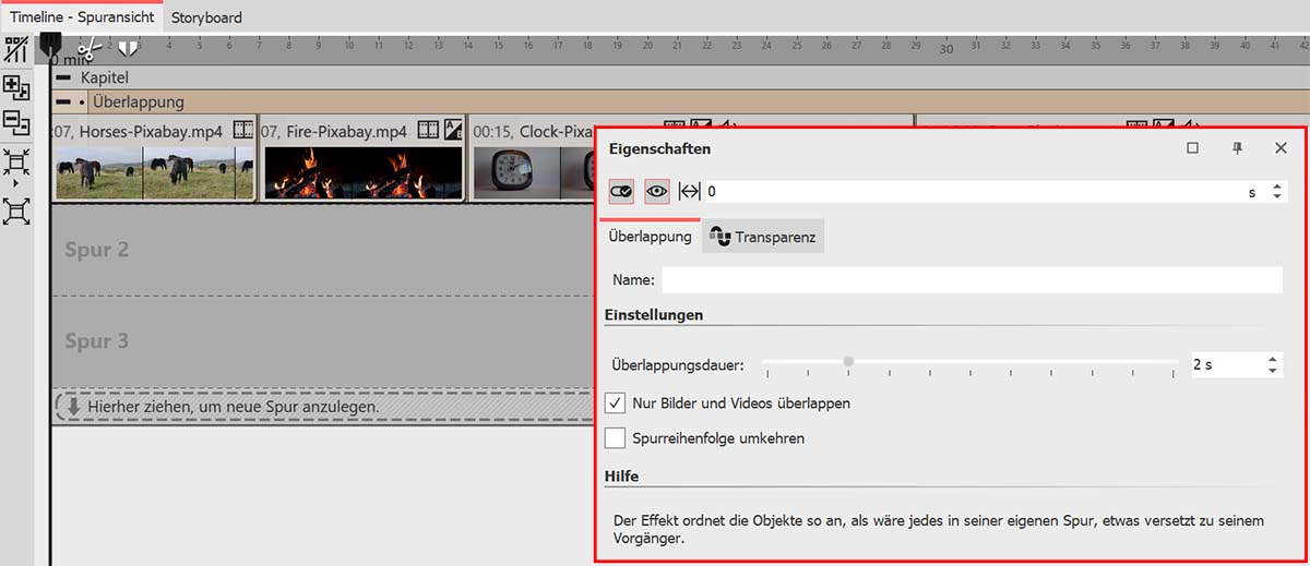 Um die Überlappung zu erhalten, können Sie das Nachfolge-Objekt in der zweiten Spur zunächst bündig an den Vorgänger setzen. In den Eigenschaften können Sie dann den Abstand, um die Dauer der Einblendung reduzieren.