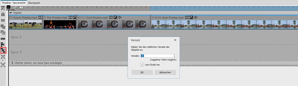 Markieren Sie zuerst die Objekte in der Timeline, die Sie überlappend anordnen wollen. Drücken Sie dann auf das „Versatz“-Symbol. Geben Sie die gewünschte Überlappungsdauer, abhängig von der gewählten Einblendungsdauer, ein und aktivieren Sie das Häkchen „vom Ende her“.