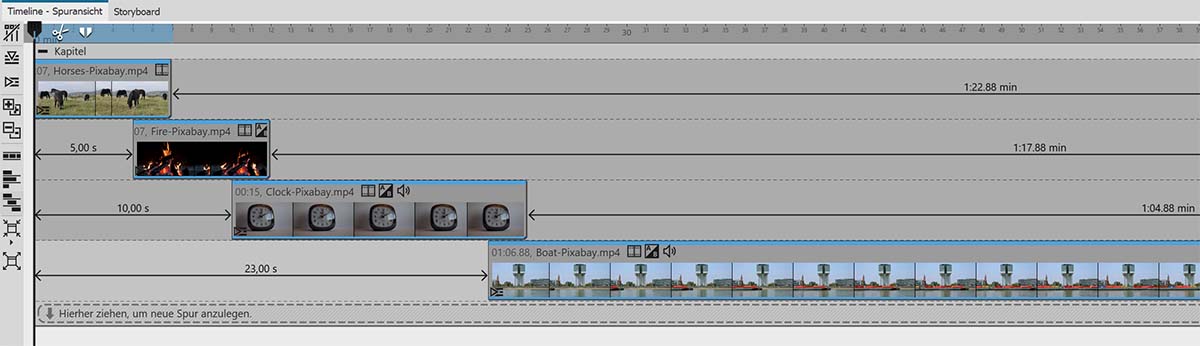 Die Objekte werden versetzt überlappend in der Timeline angeordnet.