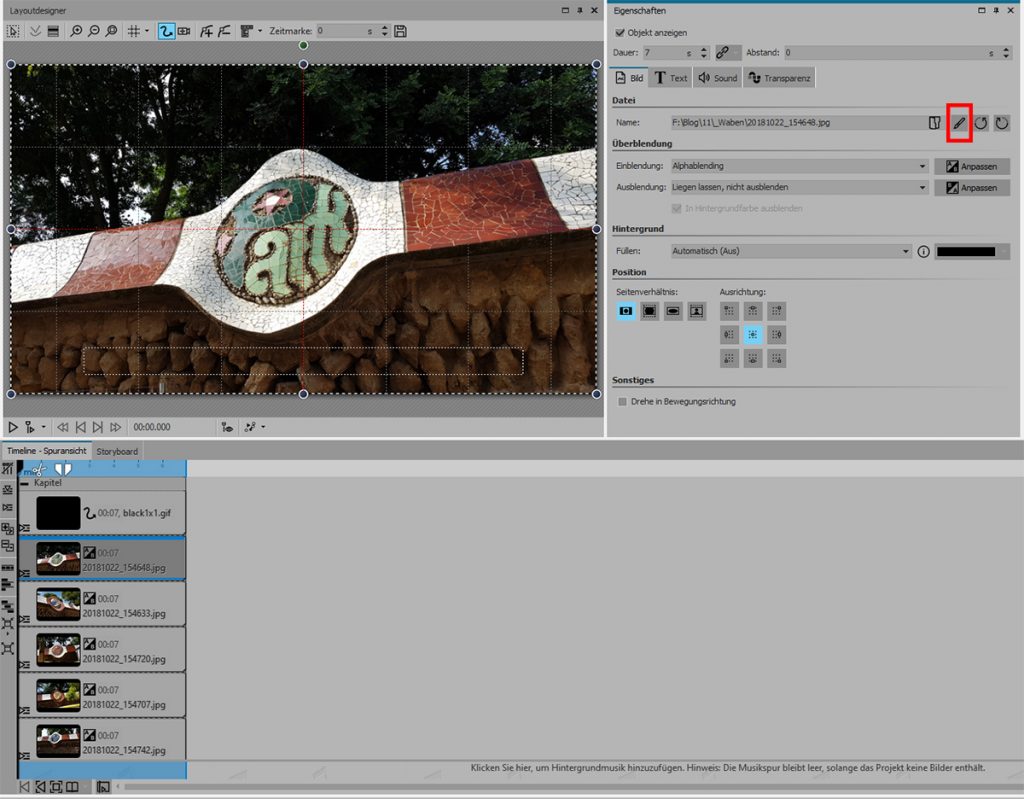 Um jetzt mehrere Bilder zusammen anordnen zu können, verkleinern Sie das erste Bild im Layoutdesigner auf die gewünschte Größe. Um diese Größe auch für die anderen Bilder zu erhalten, kopieren wir den so entstandenen Bewegungspfad. Dafür wieder das fertige Bild in der Timeline markieren und mit STRG+C in die Zwischenablage kopieren, dann die anderen Bilder markieren, die jetzt diese Größe (und vorübergehend auch Position) erhalten sollen. Klicken Sie wieder mit der rechten Maustaste darauf und wählen Sie „Eigenschaften übernehmen“.