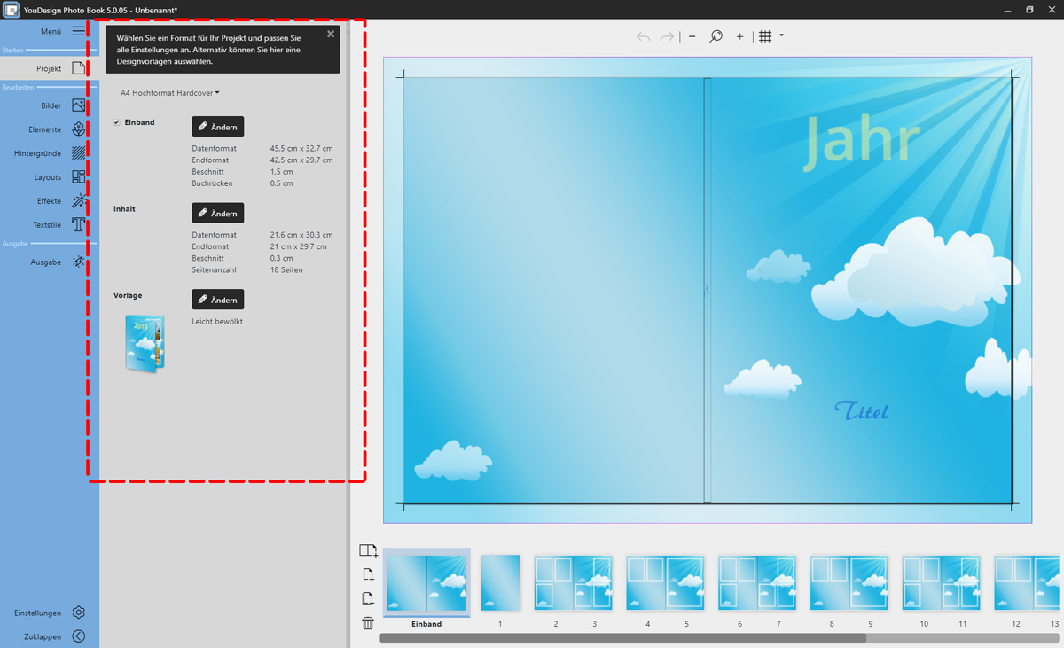 Eine größere Änderung, die gleich ins Auge springt, sind die Projekteinstellungen. Wir haben aufgeräumt und alle Maße für Sie sichtbar gemacht. Der Einband kann ausgeschalten werden, falls Sie auf ein Buchcover verzichten möchten.
