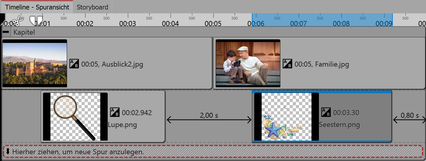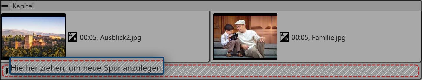 Nachdem Sie die Bilder eingefügt haben, befinden sich diese in der ersten Spur des Kapitels. Unter den eingefügten Bildern finden Sie den Schriftzug "Hierher ziehen, um neue Spur anzulegen". Auf diesen Schriftzug ziehen Sie alle Objekte, die sich in der neuen Spur befinden sollen. Alles, was sich in der Timeline in der unteren Spur befindet, wird im Layoutdesigner über den Objekten der vorhergehenden Spur dargestellt. Objekte der zweiten Spur verdecken Objekte der ersten Spur.